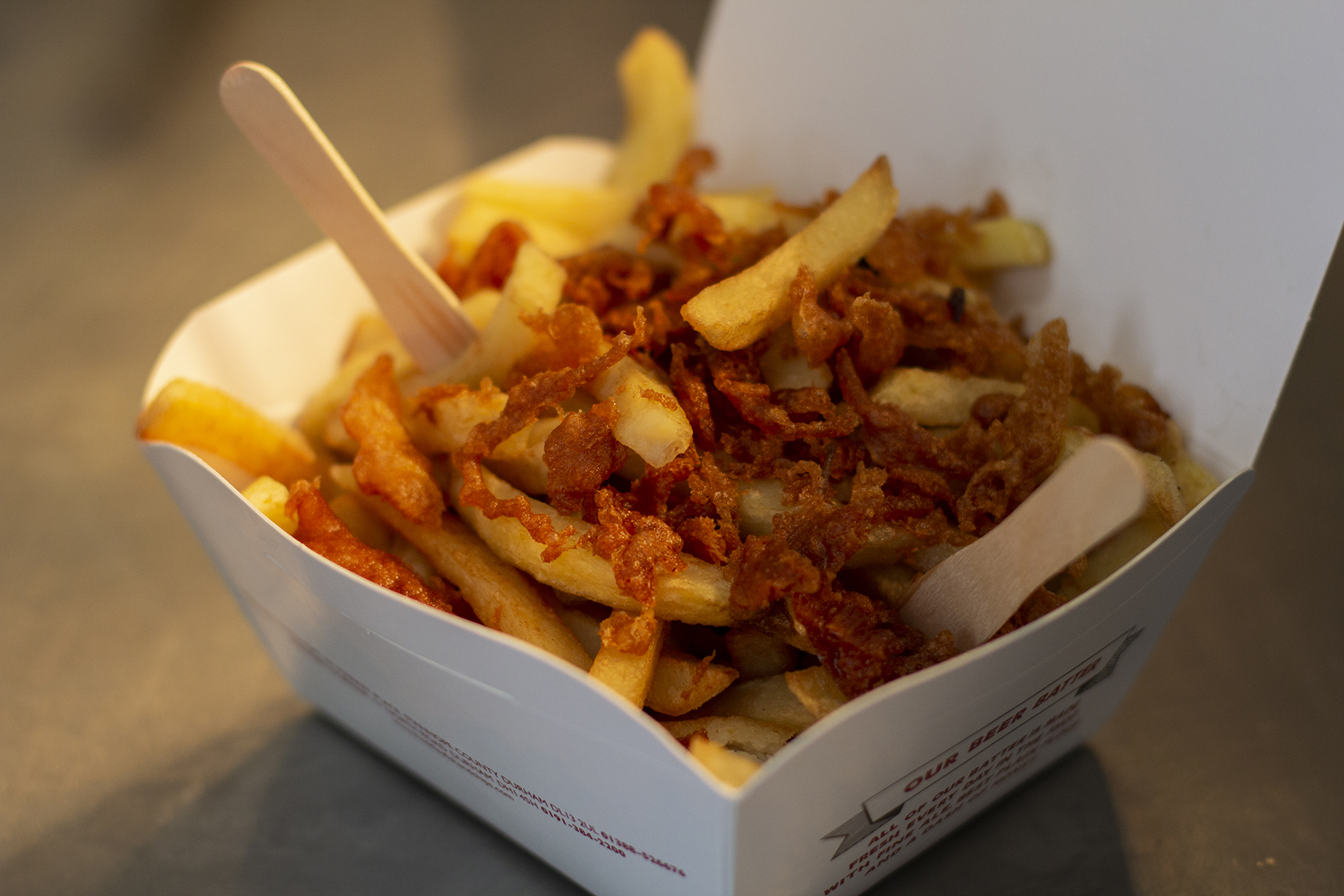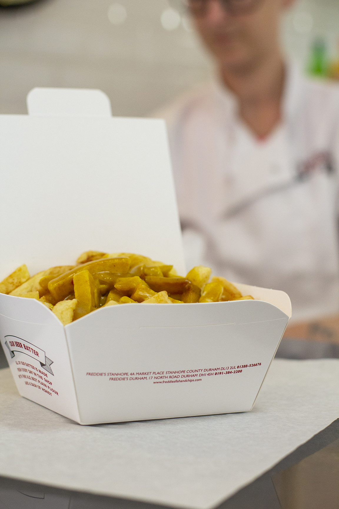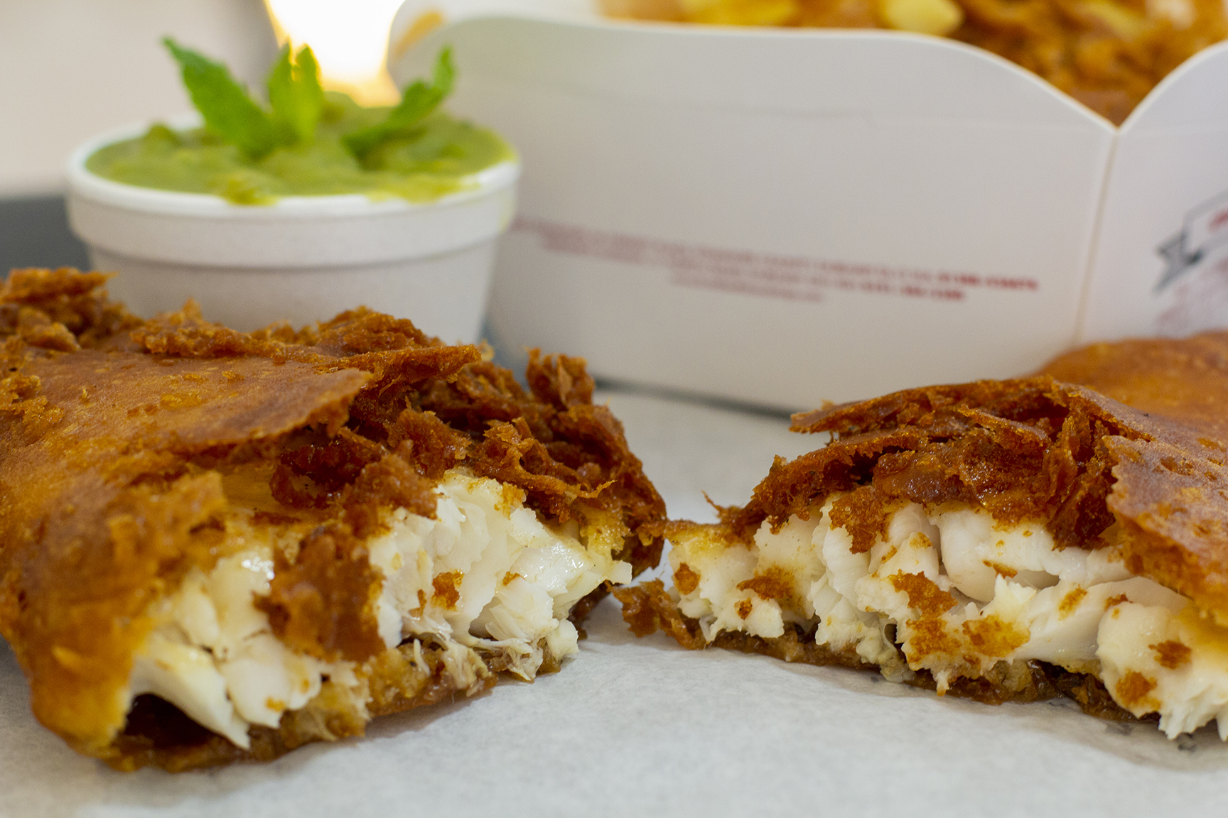 Beer-battered fish and chips, captured on-site in their Durham location.